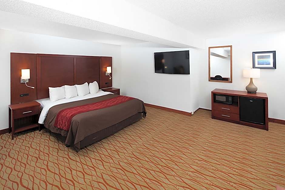 A cable TV, a compact refrigerator, microwave and coffee maker are included in this room.